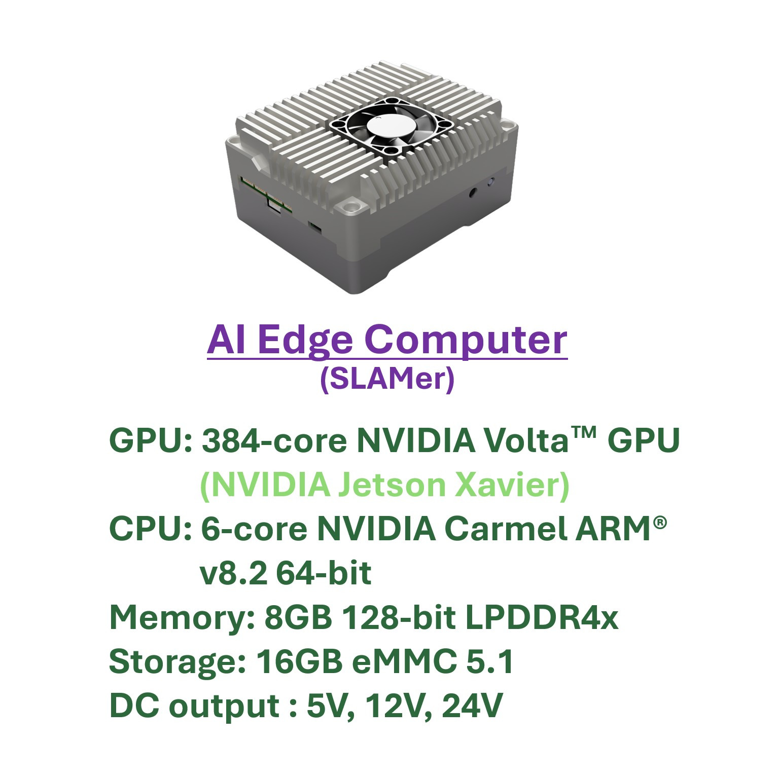 AI Edge Computer(SLAMer)는 고성능 GPU를 사용하고 다양한 전압의 자체 전원을 출력함으로써 부가적인 인터페이스를 자유롭게 장착할 수 있습니다.